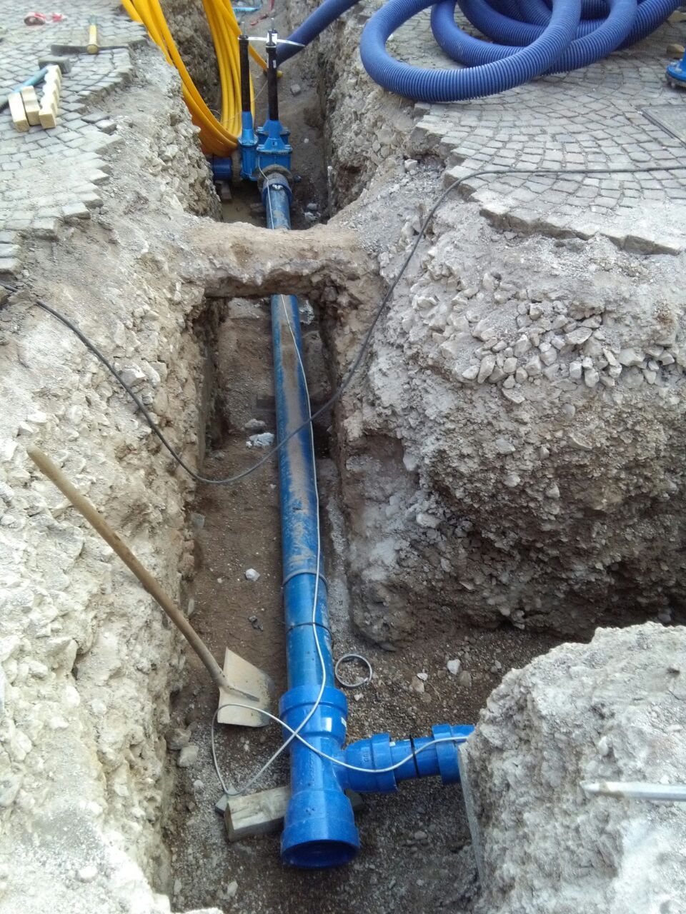 In totale son state posate 2500 m di condotte in ghisa di tipo antisfilamento e forniti più di 2,5 ton di pezzi speciali in acciaio e ghisa all’interno delle camerette di manovra. Queste sono state progettate ed eseguite con sistema di distribuzione a pettine, in modo da rendere indipendente ed intercettabile ogni derivazione finale.